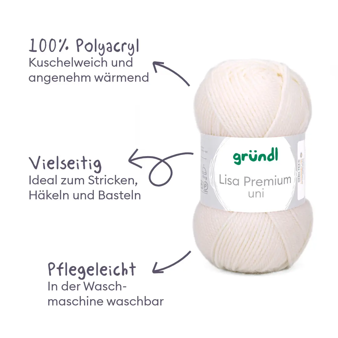 Alle lieben Lisa! Unsere Lisa Premium Uni ist nicht nur äußert empathisch und aufgeschlossen, sie versteht sich einfach mit allen! Ihre Mission ist es, dass sich alle bei ihr gut aufgehoben fühlen. Und deshalb mögen wir sie auch so sehr. Das Garn mit seinem wollartigen Charakter ist wärmend und weich zugleich. Es ist sehr pflegeleicht und problemlos waschbar. Lisa Premium trocknet rasch und ist sehr formbeständig. Du wirst die klaren, brillanten Farben lieben! Liebste Lisa, schön, dich in unserer Familie zu haben. Wir freuen uns schon auf wunderbare Kreativ-Abenteuer mit dir, du unglaubliches Universalgarn!