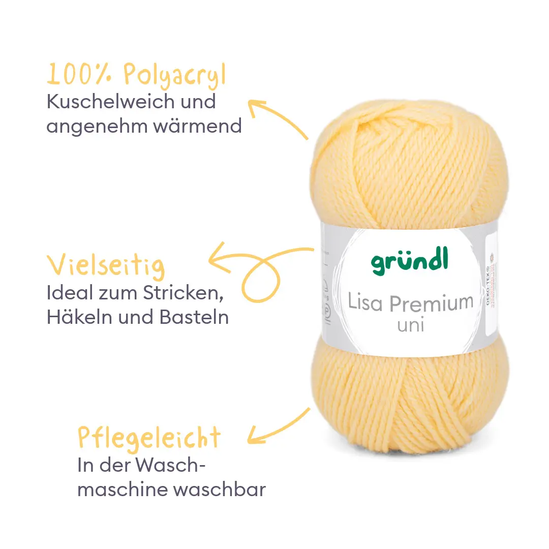 Alle lieben Lisa! Unsere Lisa Premium Uni ist nicht nur äußert empathisch und aufgeschlossen, sie versteht sich einfach mit allen! Ihre Mission ist es, dass sich alle bei ihr gut aufgehoben fühlen. Und deshalb mögen wir sie auch so sehr. Das Garn mit seinem wollartigen Charakter ist wärmend und weich zugleich. Es ist sehr pflegeleicht und problemlos waschbar. Lisa Premium trocknet rasch und ist sehr formbeständig. Du wirst die klaren, brillanten Farben lieben! Liebste Lisa, schön, dich in unserer Familie zu haben. Wir freuen uns schon auf wunderbare Kreativ-Abenteuer mit dir, du unglaubliches Universalgarn!