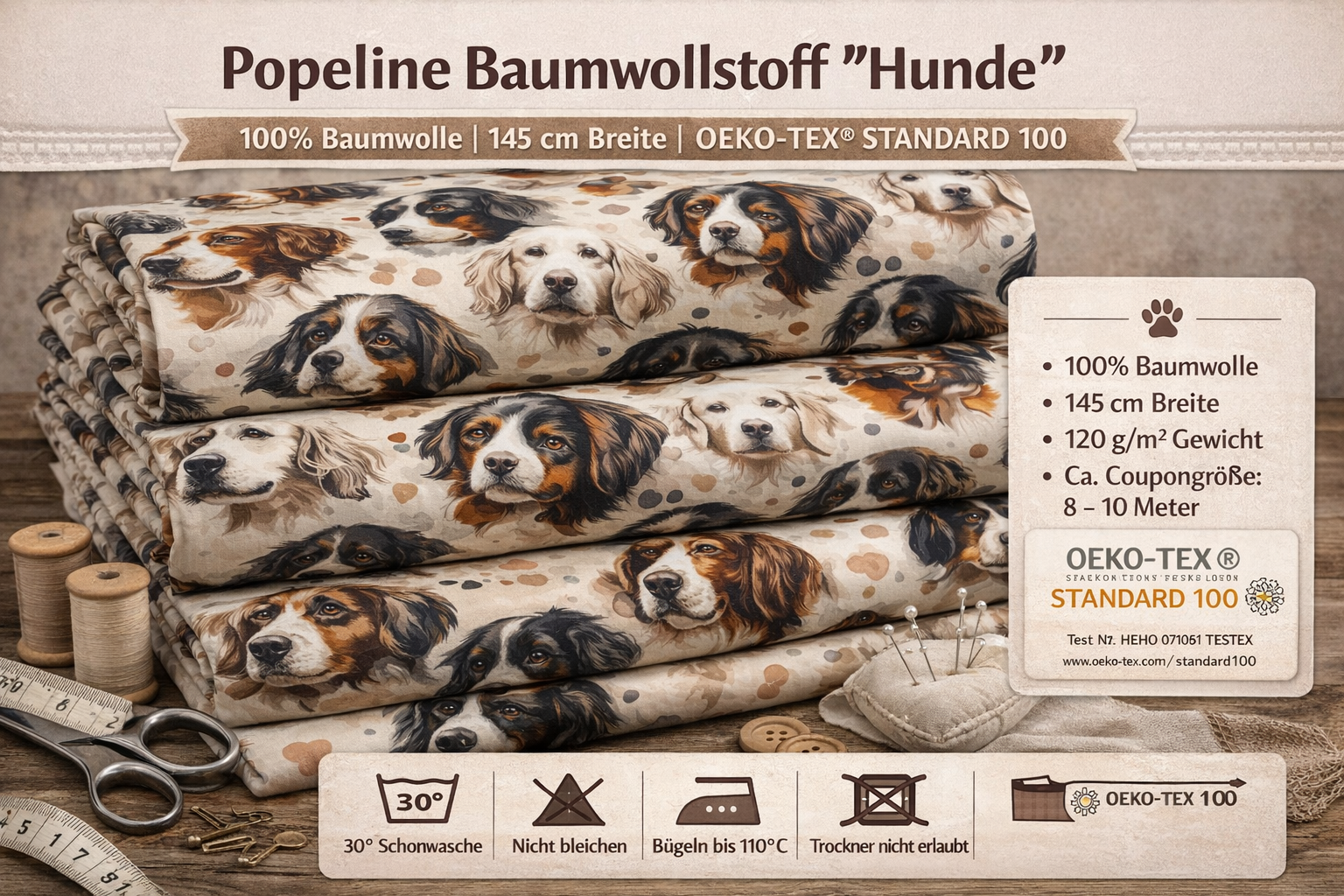 Dieser hochwertige Popeline Baumwollstoff begeistert mit einem detailreichen Digitaldruck im Pferde-Hund-Design und ist perfekt für alle Pferdefans und Liebhaber besonderer Stoffmotive. Durch seine angenehm glatte, leichte Qualität eignet sich der Stoff ideal für kreative Nähprojekte wie Blusen, Hemden, Kleider, Röcke, Kinderkleidung, Accessoires oder Dekorationen.