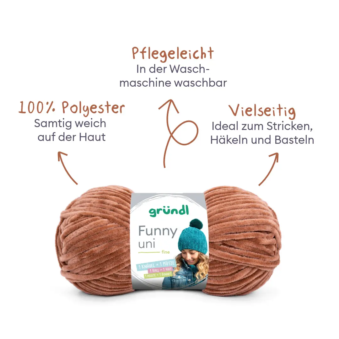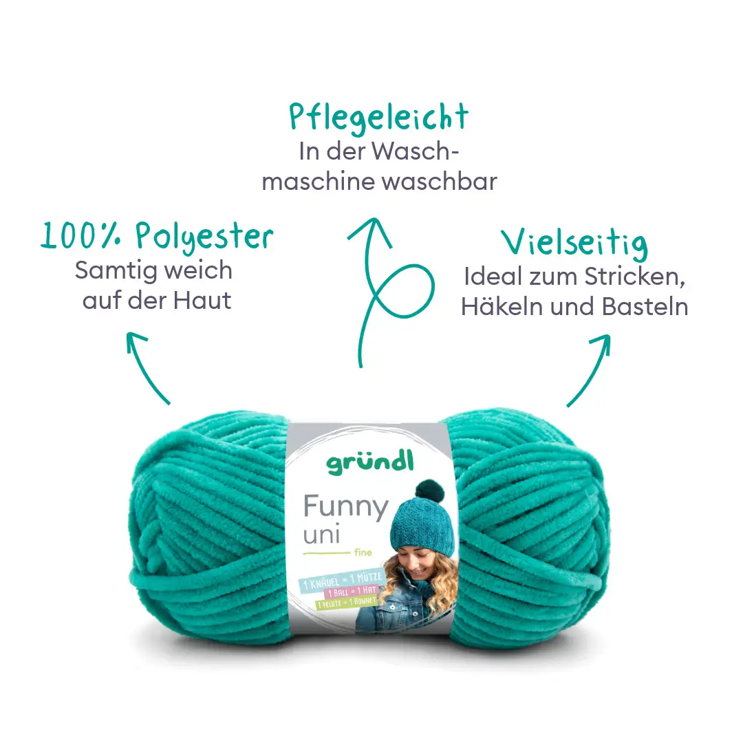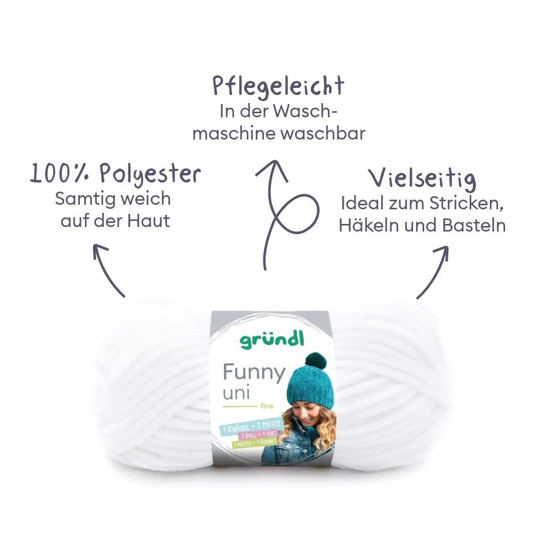 Die Gründl Funny Uni ist ein modernes Effektgarn mit weicher Fransenstruktur, das jedem Strick- oder Häkelprojekt eine besondere Optik verleiht. Durch die flauschige Oberfläche entstehen einzigartige, lebendige Ergebnisse mit voluminösem Charakter.