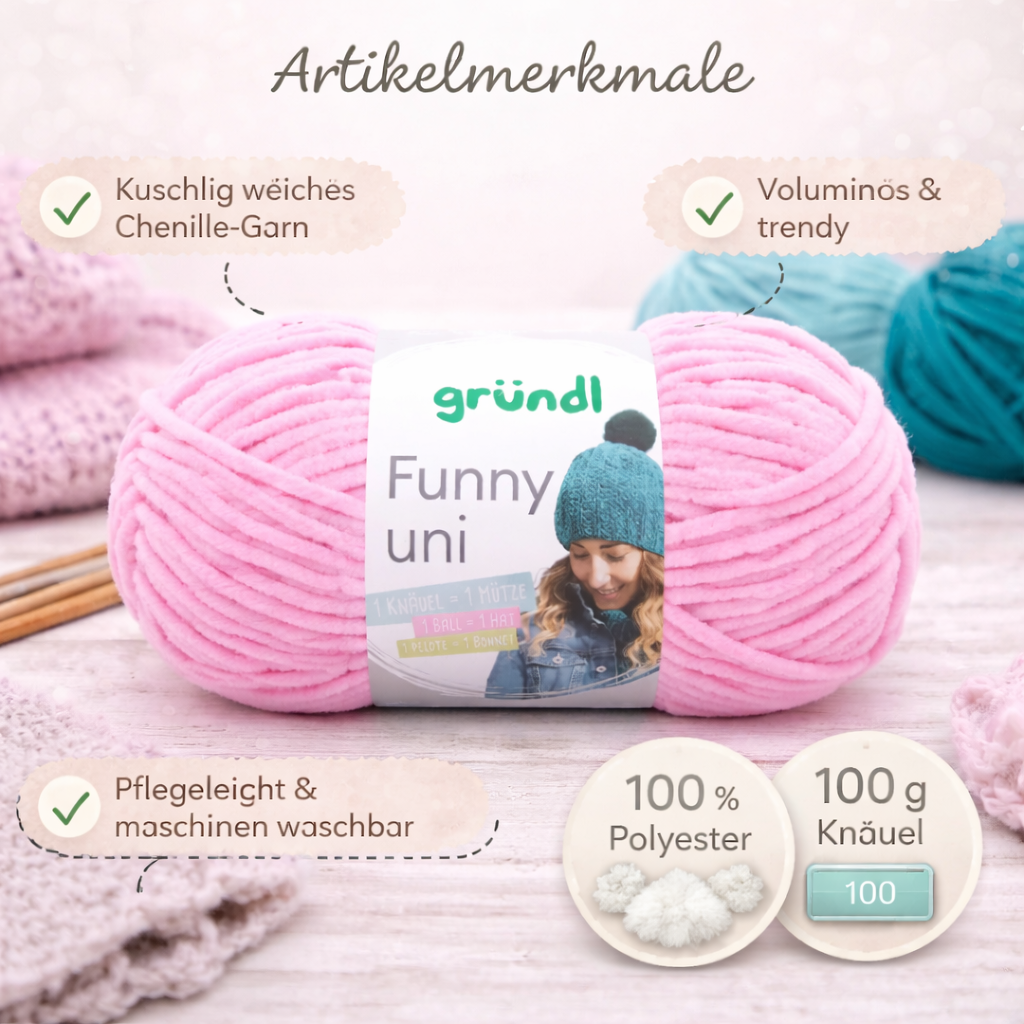 Das Garn ist angenehm weich und eignet sich hervorragend für kreative Projekte wie Schals, Loops, Accessoires oder dekorative Elemente. Besonders Anfänger profitieren davon, da kleine Unregelmäßigkeiten durch die Struktur kaum sichtbar sind.
