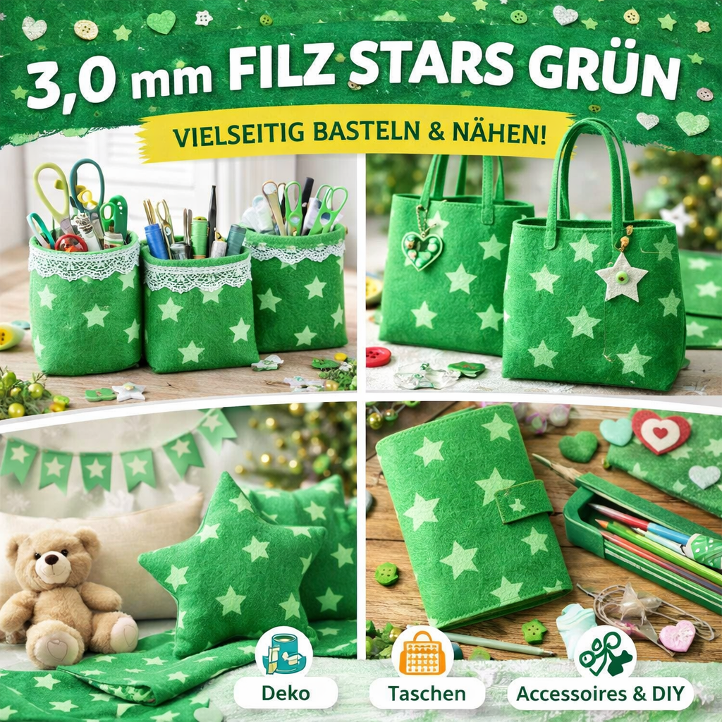 Dieser hochwertige Filzstoff mit Sternen in Grün ist perfekt für kreative Näh- und Bastelprojekte. Mit einer Materialstärke von 3,0 mm bietet der Filz eine stabile, formfeste Qualität und lässt sich gleichzeitig gut verarbeiten.