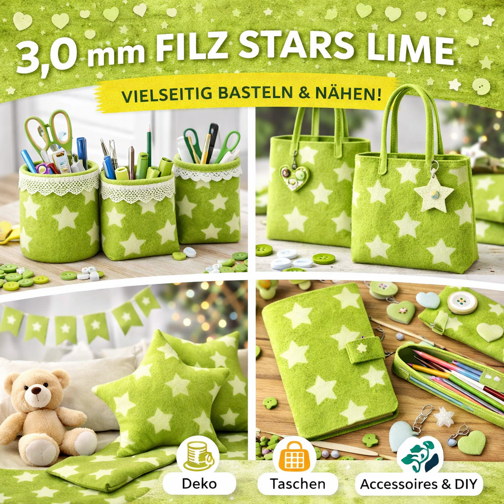Dieser hochwertige Filzstoff mit Sternen in Lime (frisches Grün) ist ideal für kreative Näh- und Bastelprojekte. Mit einer Stärke von 3,0 mm überzeugt der Filz durch seine stabile und formfeste Qualität und lässt sich gleichzeitig angenehm verarbeiten.