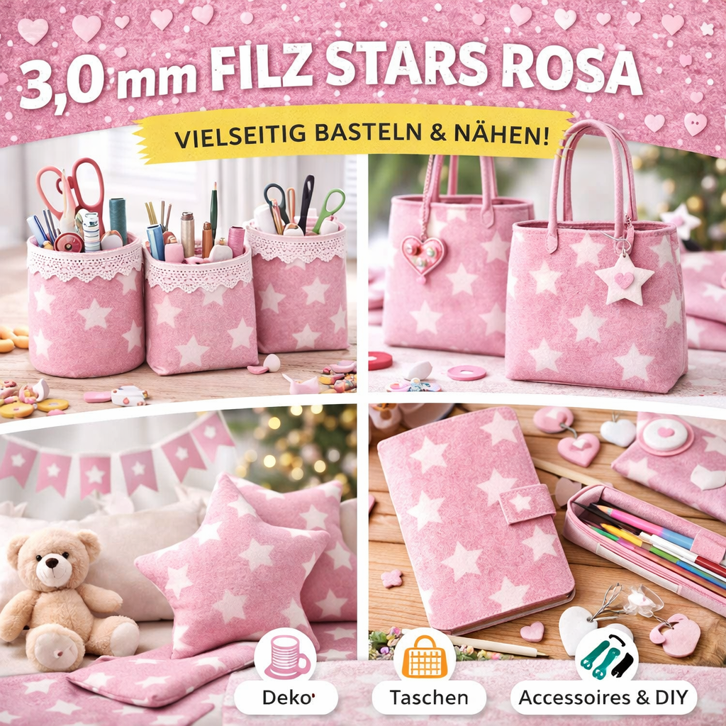 Dieser hochwertige Filzstoff mit Sternen in Rosa ist perfekt für kreative Näh- und Bastelprojekte. Mit einer Stärke von 3,0 mm bietet der Filz eine stabile und formfeste Qualität und lässt sich gleichzeitig angenehm verarbeiten.