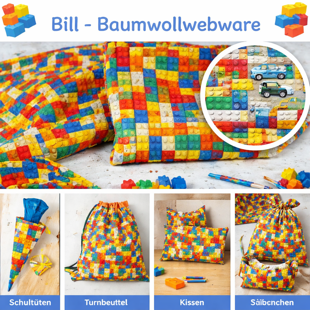 Weiterführende Links zu "Bill Baumwollstoff mit Klemmbausteinen & Fahrzeugen – ideal für Schultüten & Kinderprojekte"