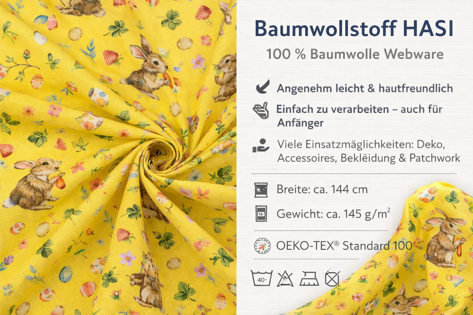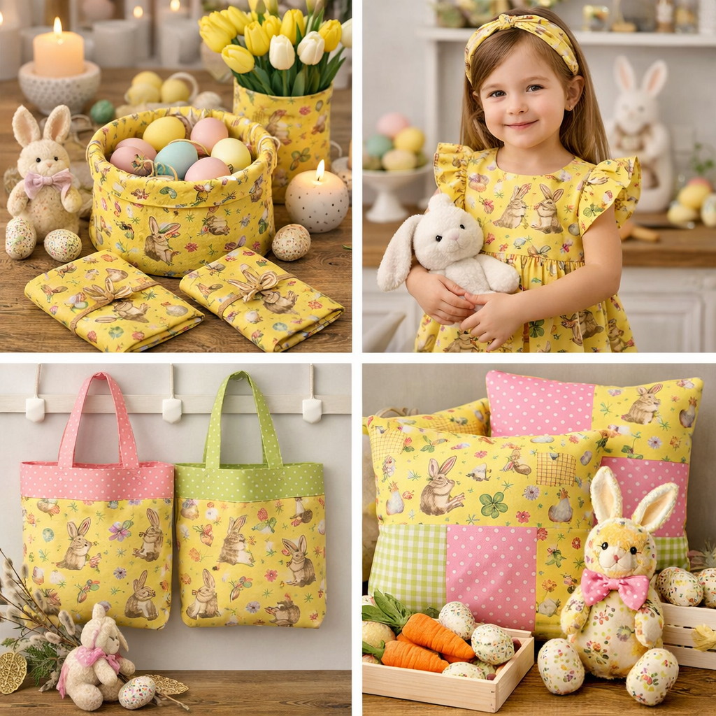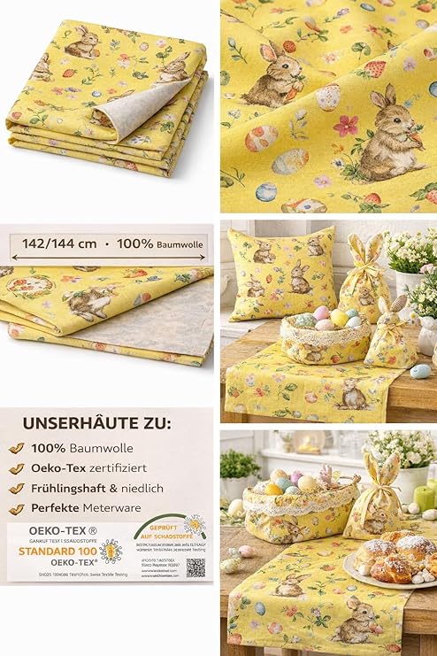 Dieser liebevoll gestaltete Baumwollstoff mit niedlichem Hasenmotiv ist ein echtes Highlight für deine Osterprojekte. Die hochwertige Webware besteht aus 100 % Baumwolle, ist angenehm leicht und lässt sich besonders einfach verarbeiten – ideal auch für Nähanfänger.