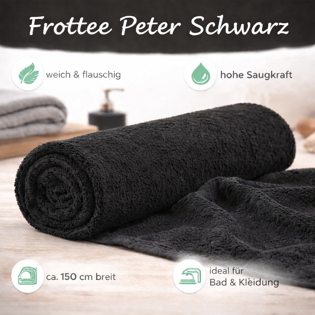 Unser hochwertiger Frottee Peter in Schwarz überzeugt durch seine besonders weiche, flauschige Oberfläche und hohe Saugfähigkeit. Der Stoff ist angenehm auf der Haut und eignet sich perfekt für zahlreiche Nähprojekte rund um Bad, Wellness und Bekleidung.