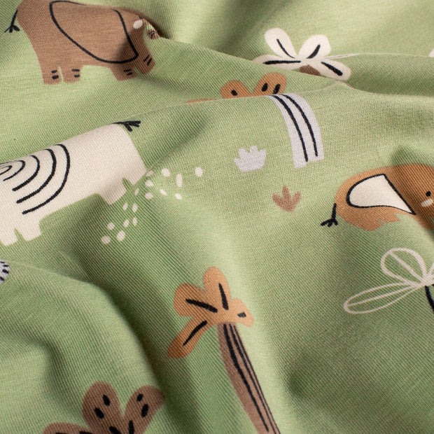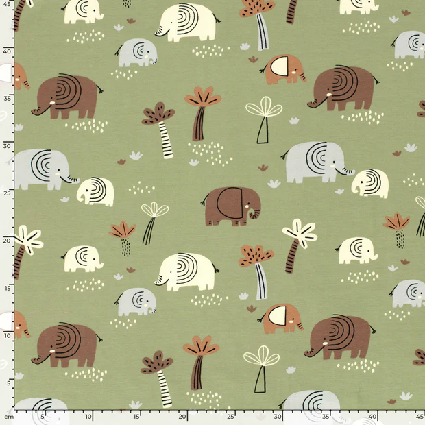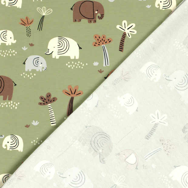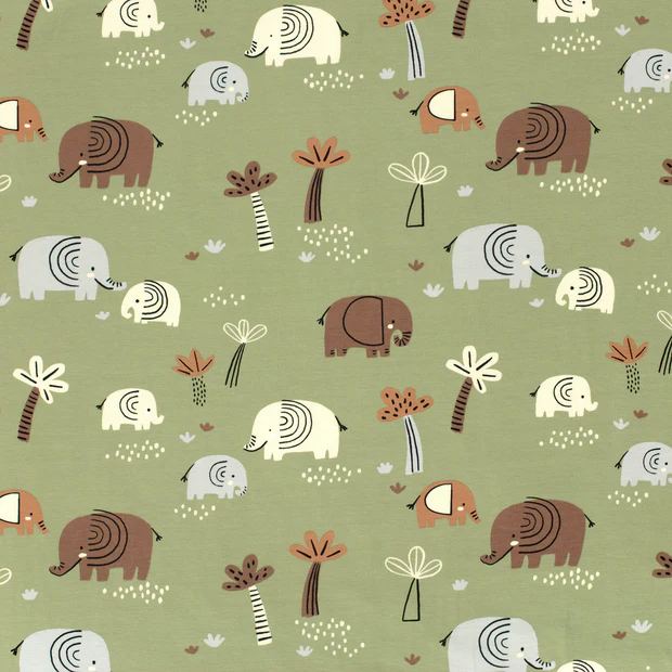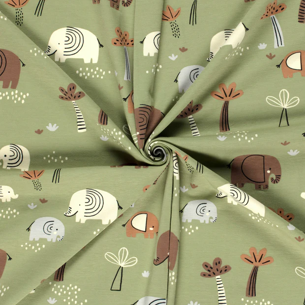 Weiterführende Links zu "Baumwolle Jersey Stoff bedruckt Elefanten Olivgrün"