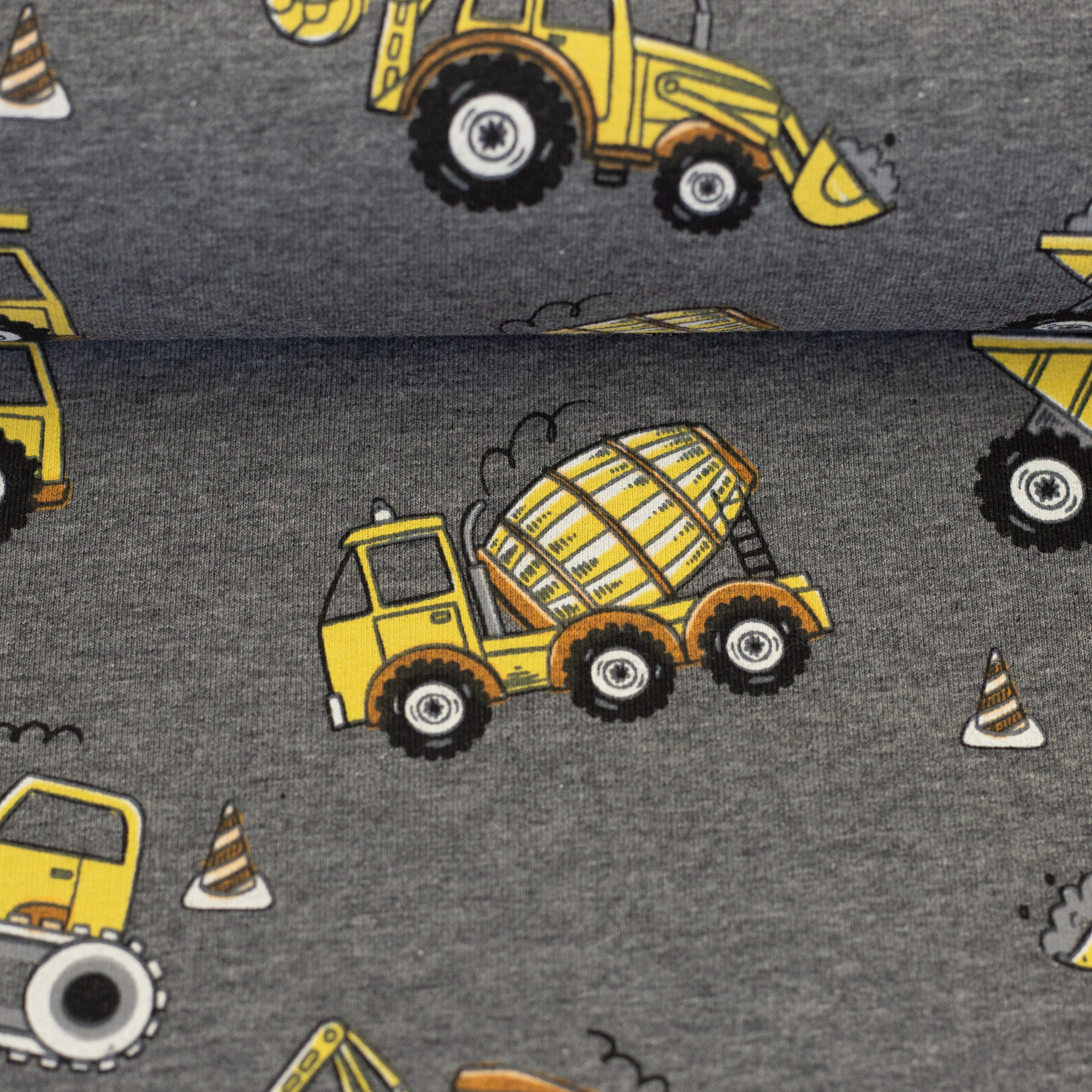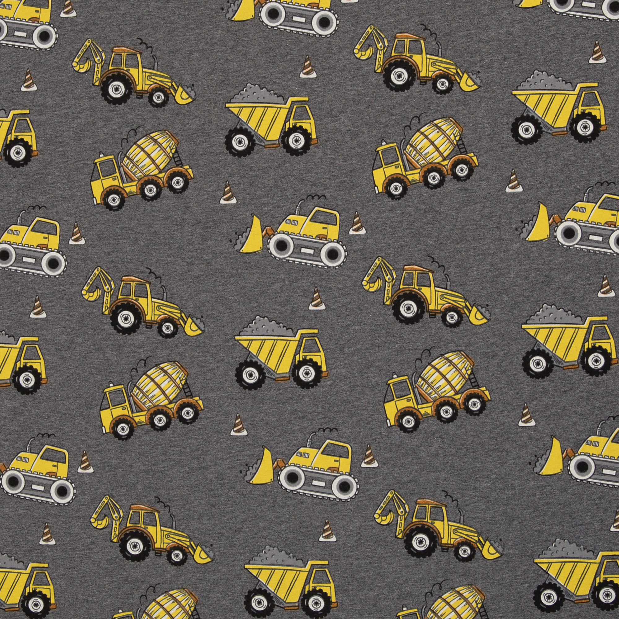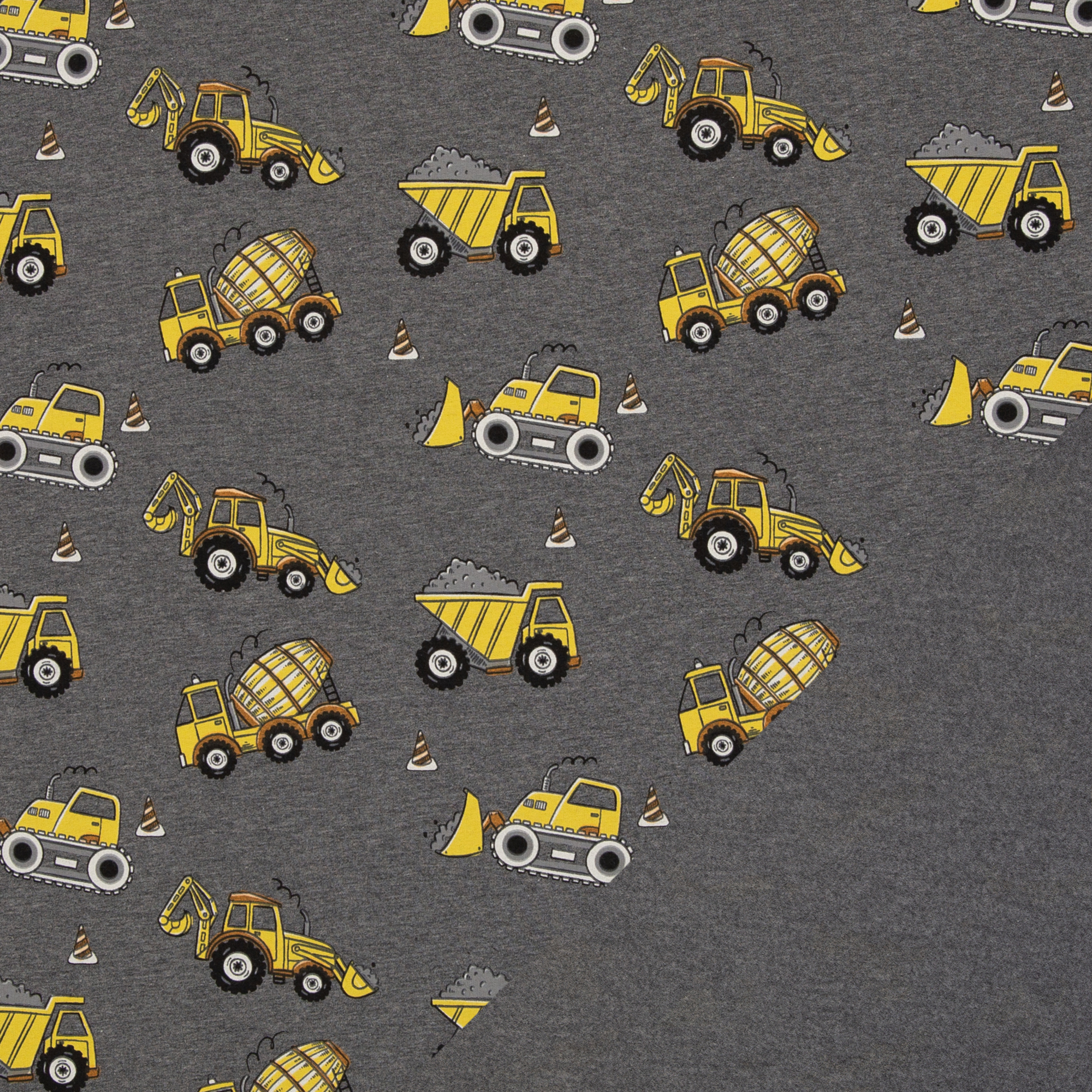 Baumwolljersey bedruckt mit Baumaschinen ist ein pflegeleichter und vielseitig einsetzbarer Stoff. Er bietet eine sehr große Farbpalette mit vielen brillianten Farben. Diese sind ideal aufeinander abgestimmt, sodass sich die Stoffserien Heike, Eike, Meike und Vanessa perfekt ergänzen.