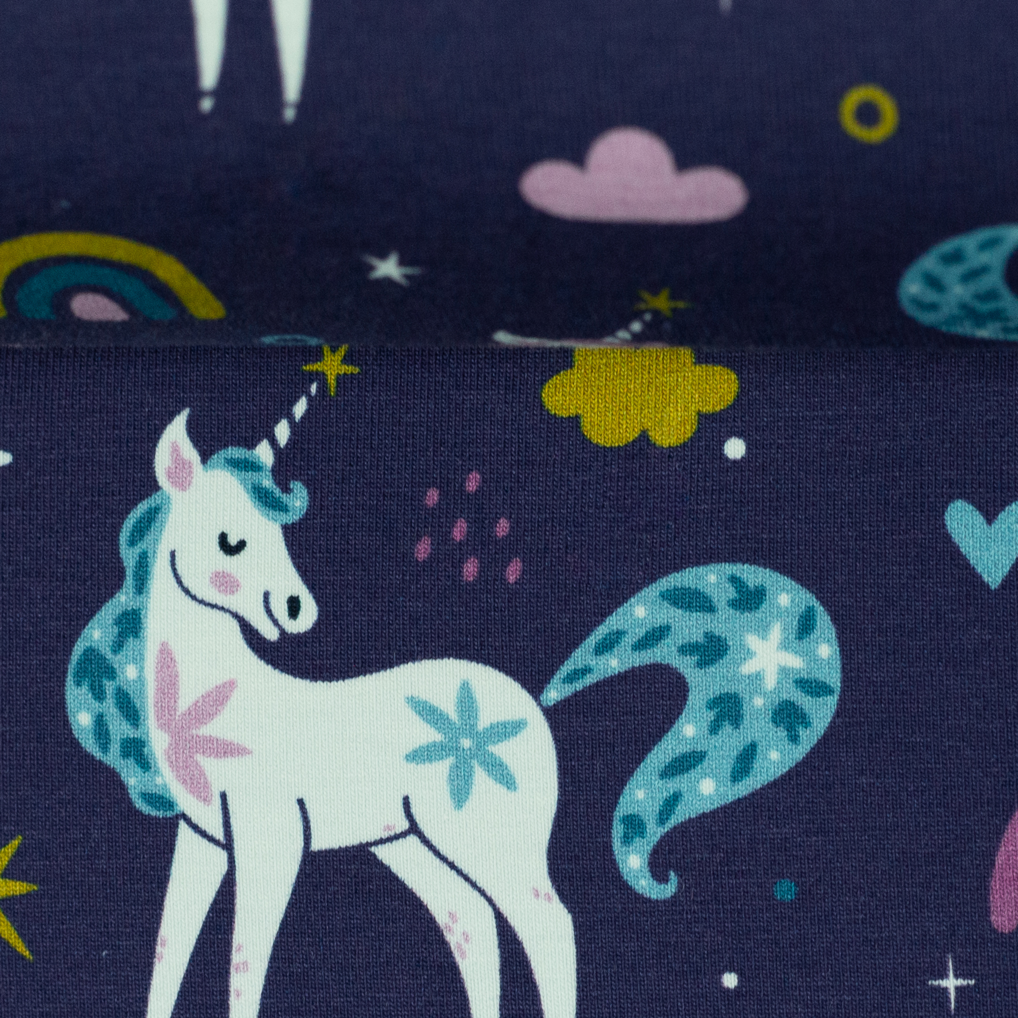 Verspielte Einhörner mit Regenbögen, Wolken, Sternen und bunten Wimpelketten auf dunklem Fond.