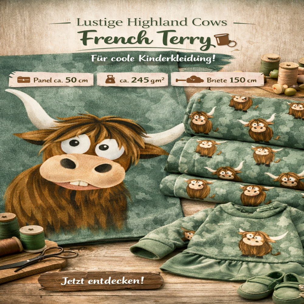 Weiterführende Links zu "French Terry „Holy Cow“ – Highland Cows Panel & Allover, 95% Baumwolle"