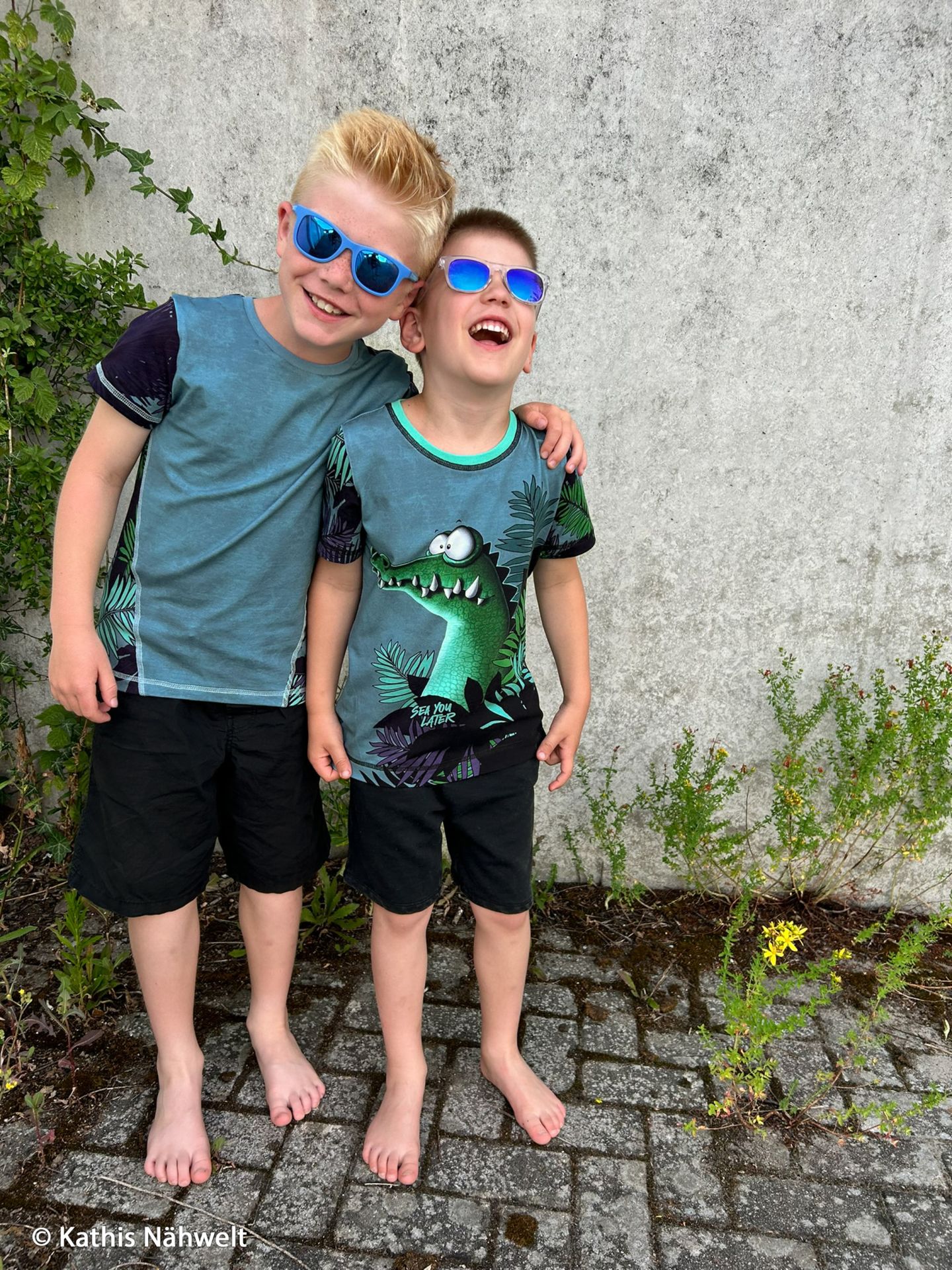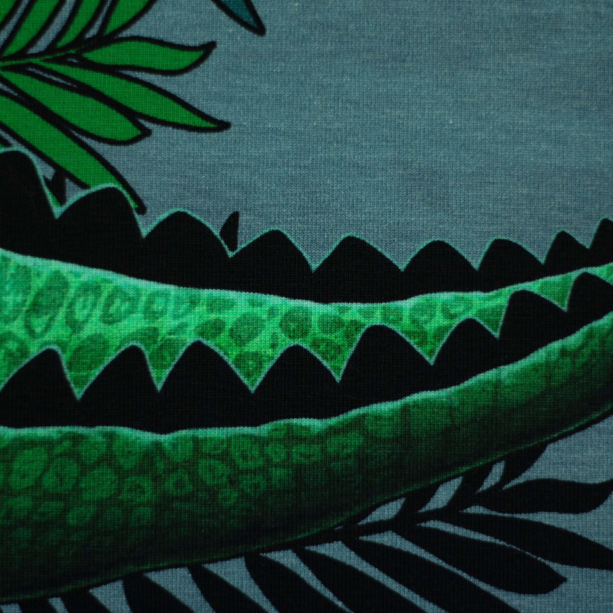 Der Stoff besteht aus einem angenehm weichen Baumwolljersey mit Elasthananteil, ist dehnbar und dadurch ideal für bequeme Kinderkleidung. Perfekt geeignet für Shirts, Hoodies, Kleider oder Pyjamas – besonders für kleine Abenteurer und Krokodil-Fans.