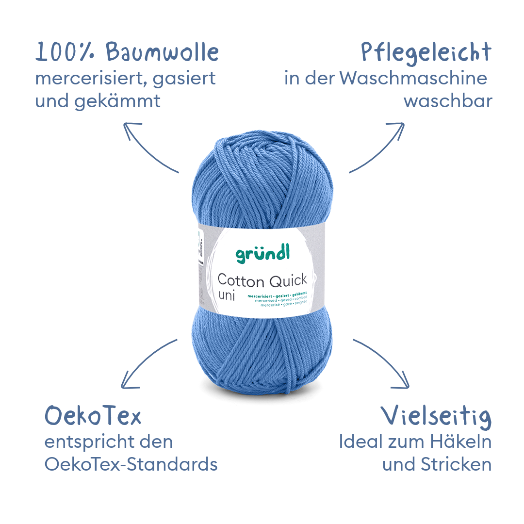 Gründl Cotton Quick uni ist ein wahres Multitalent und ein echter Klassiker unter den Garnen. Mit seiner fröhlichen Farbpalette bringt dieses Baumwollgarn auf jeden Fall Farbe und gute Laune in dein Leben. Ob für sommerliche Kleidungsstücke, kreative Amigurumi oder dekorative Wohnaccessoires – Cotton Quick uni ist die perfekte Wahl für all deine Strick- und Häkelprojekte.